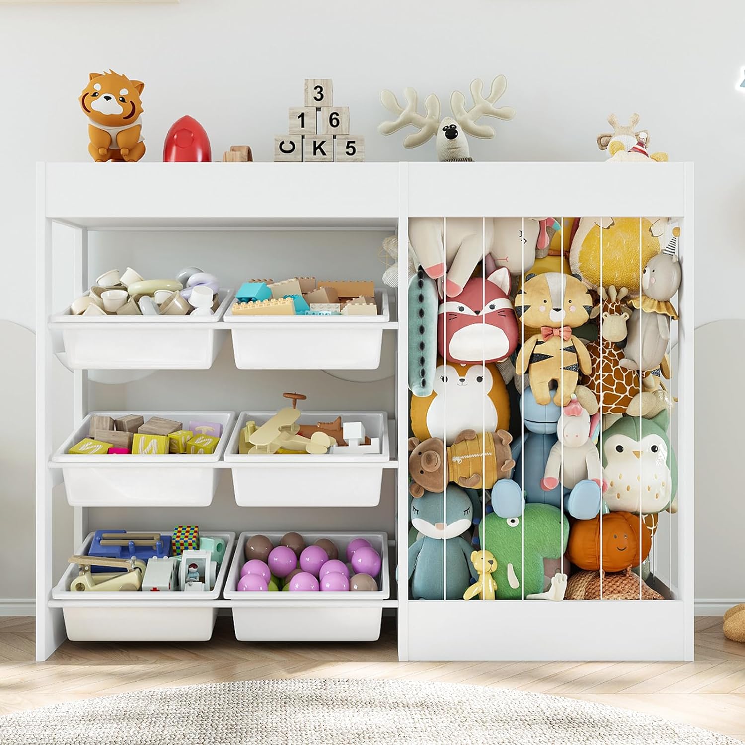 | Additional Features | Stuffed animal storage, Toy bins, Wooden toy storage |